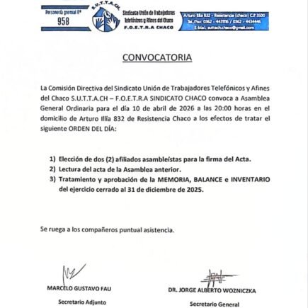 El día Viernes 10 de Abril de 2026 a las 20 hs. se desarrollará la Asamblea General Ordinaria.